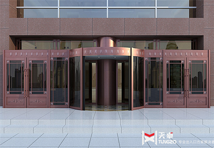 西安天卓牌環(huán)柱式三翼,四翼旋轉(zhuǎn)門,很好的解決了建筑物入口中心有承重結(jié)構(gòu)柱無法安裝旋轉(zhuǎn)門的難題。它將承重結(jié)構(gòu)柱包飾起來作為旋轉(zhuǎn)門的中心柱,門扉及展箱繞柱旋轉(zhuǎn),體現(xiàn)出豪華氣派的美感。環(huán)柱旋轉(zhuǎn)門外觀補(bǔ)素大方,運(yùn)行安全穩(wěn)定。能有效的隔斷內(nèi)外氣流、防風(fēng)、防塵、靜音、保持內(nèi)部溫度。